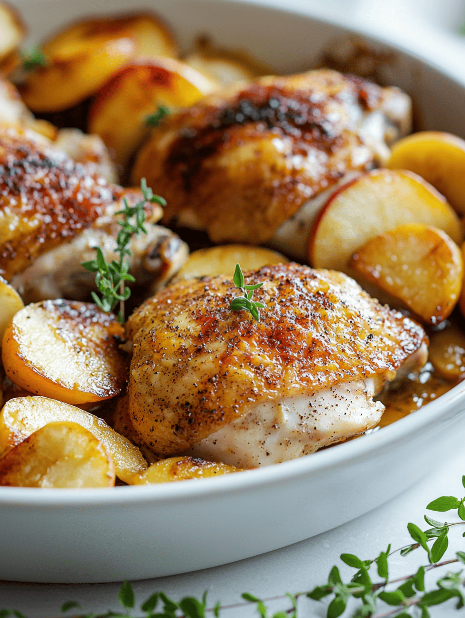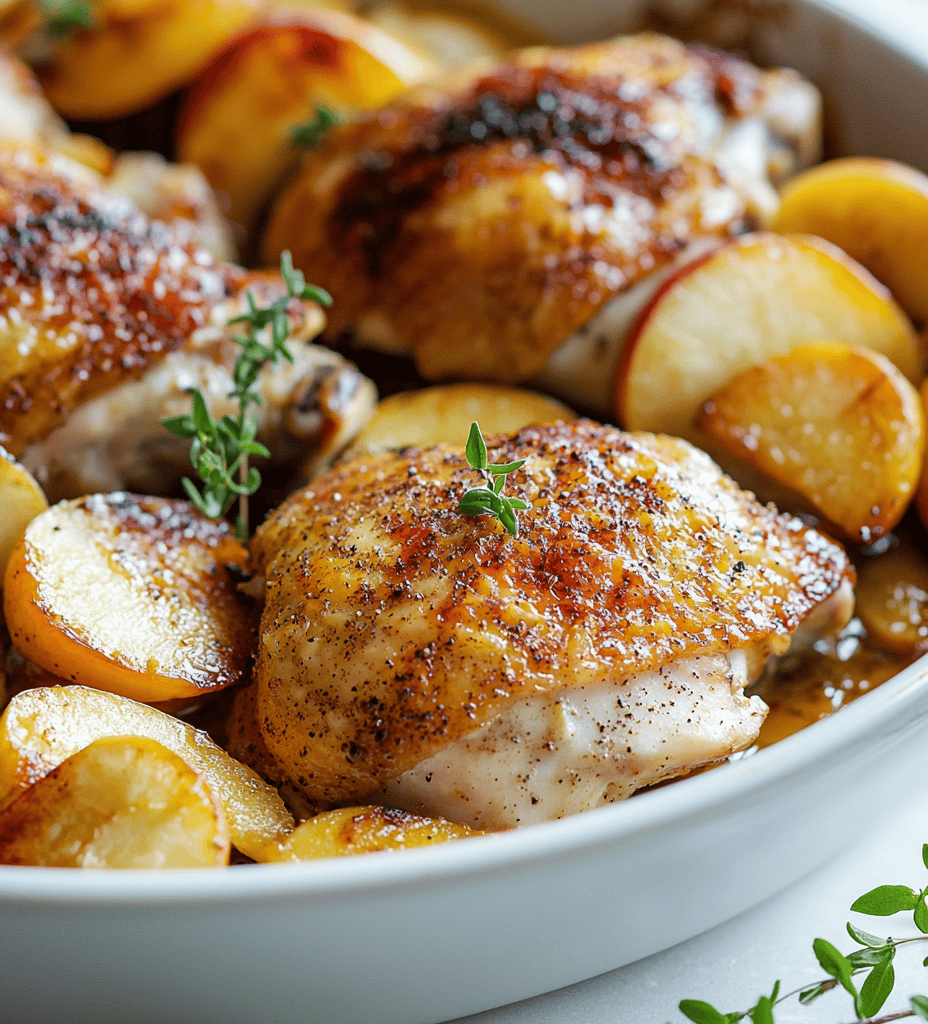 This dish features bone-in chicken pieces seared until golden, then roasted alongside sliced apples, garlic, and warm spices in a single skillet. The final result is a tender, juicy chicken with caramelized fruit and a fragrant cinnamon-scented pan sauce, showcasing a blend of hearty and sweet fall flavors.