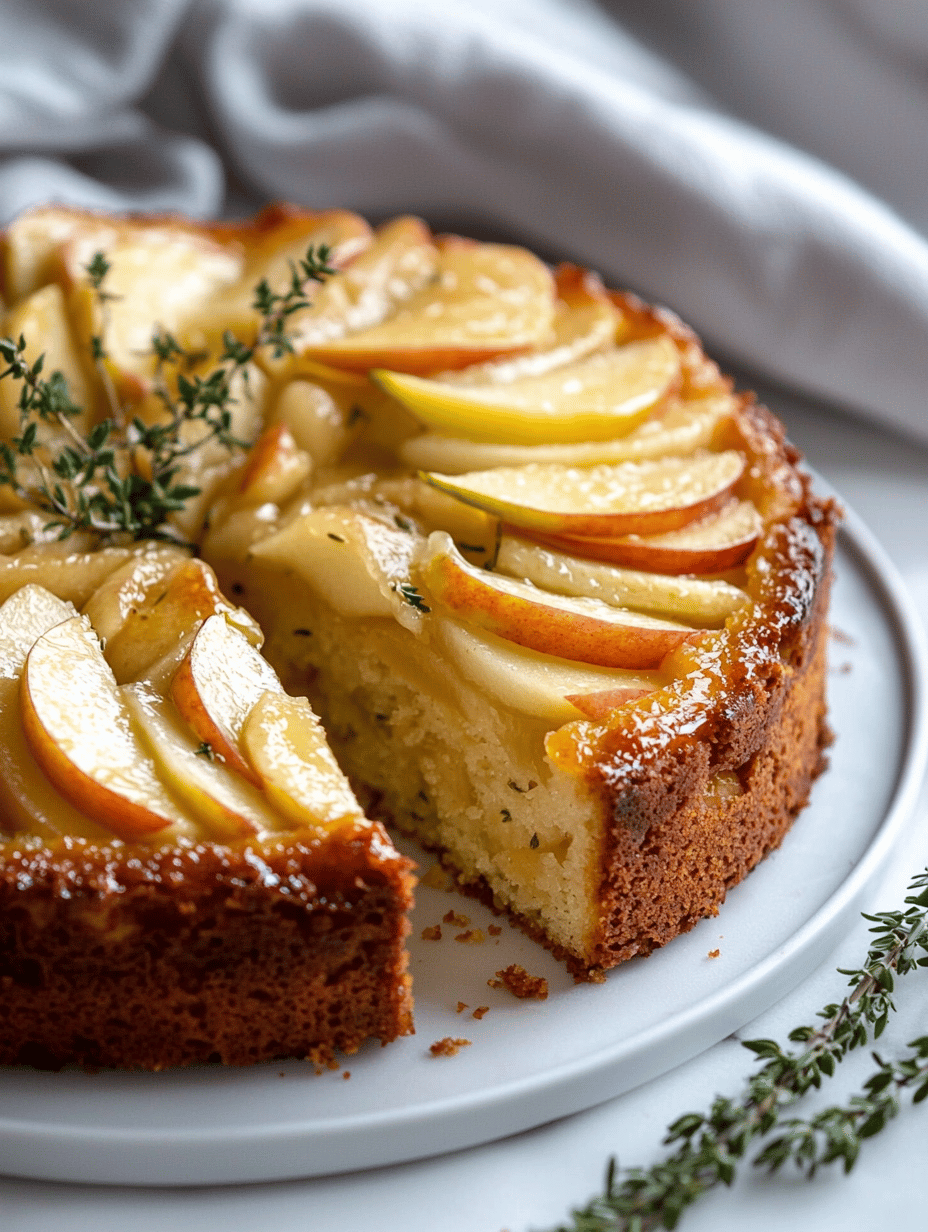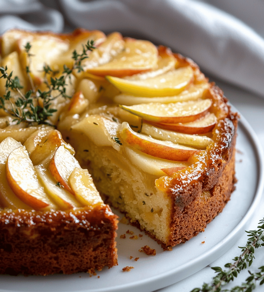 This apple thyme cake features a tender crumb with a crispy topping, showcasing baked apples infused with a hint of thyme. The batter combines sliced apples, fresh herbs, and a simple flour mixture, creating a moist and aromatic dessert with contrasting textures that are both soft and crunchy. The cake is baked until golden brown, with caramelized apple edges and a fragrant, herbaceous aroma.