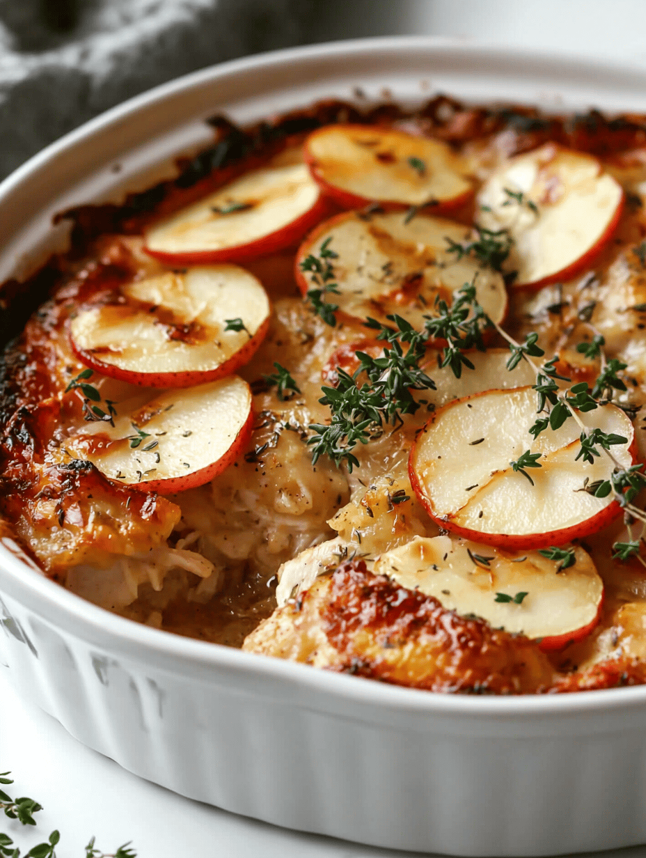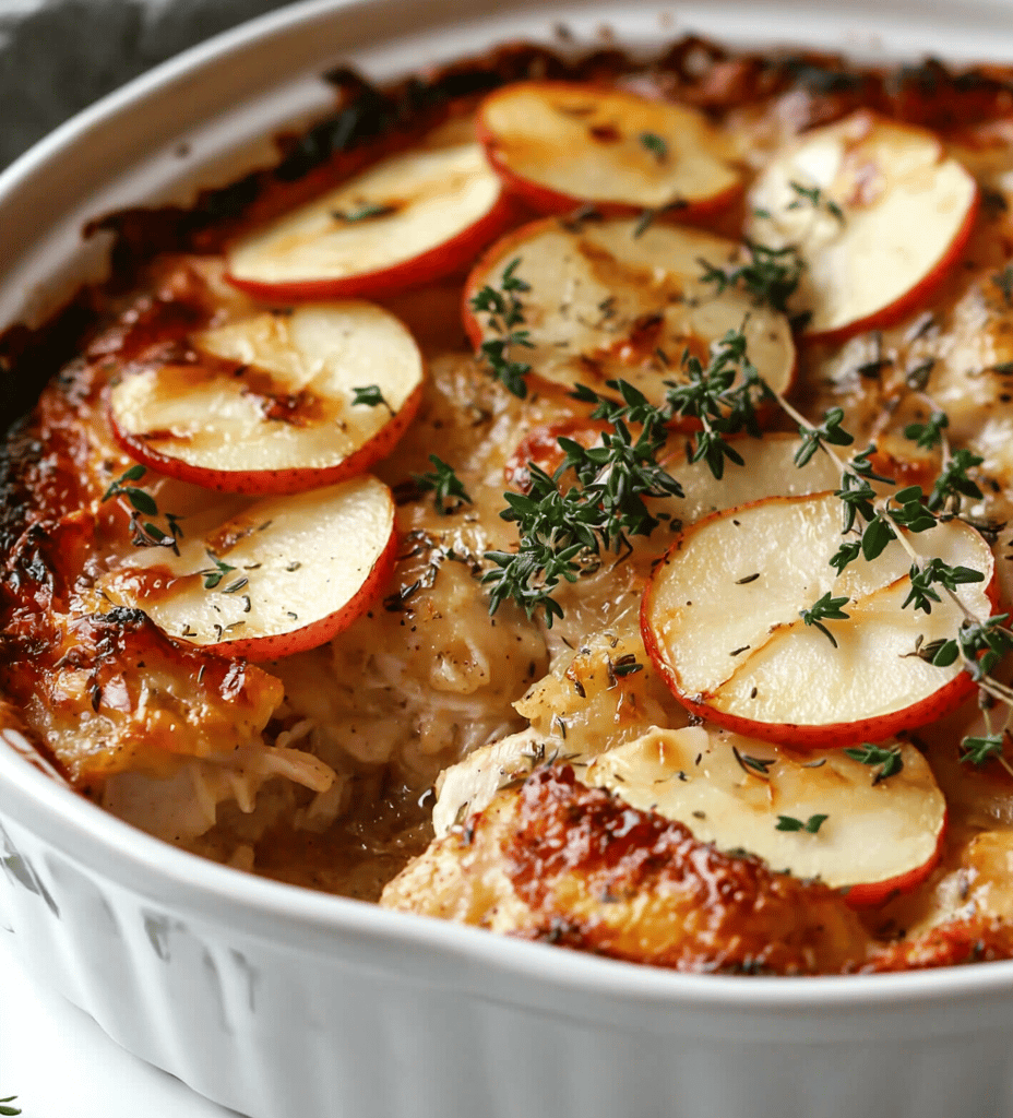 - Remove from the oven and let it rest for 5 minutes. Serve hot, enjoying the aroma of herbs, baked apples, and rich cheese combined with tender chicken.