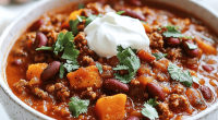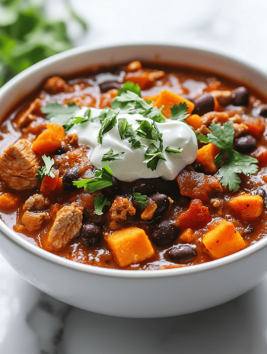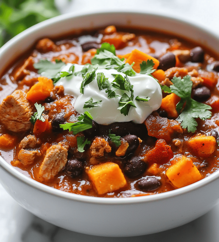 This chili features ground turkey and roasted sweet potatoes simmered together with warming spices, resulting in a hearty, velvety dish. The sweet potatoes mellow the heat, providing a natural sweetness and a smooth texture, while the turkey adds savory richness. The final appearance is a thick, fragrant stew with vibrant hints of cinnamon and apple cider, topped with a rustic, inviting look.
