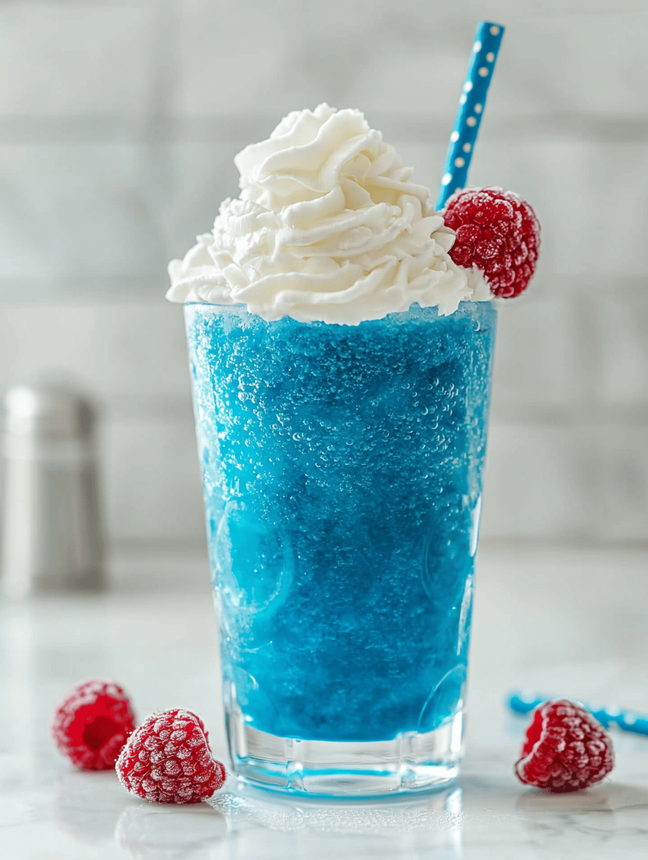 A vibrant, icy beverage made by blending frozen blue raspberry fruit with a simple syrup and lemon juice, resulting in a tart and refreshing slushie. The mixture has a bright blue hue, with a crunchy, icy texture that melts smoothly in the mouth. It combines fruity sweetness with tangy zest for a fun summer treat.