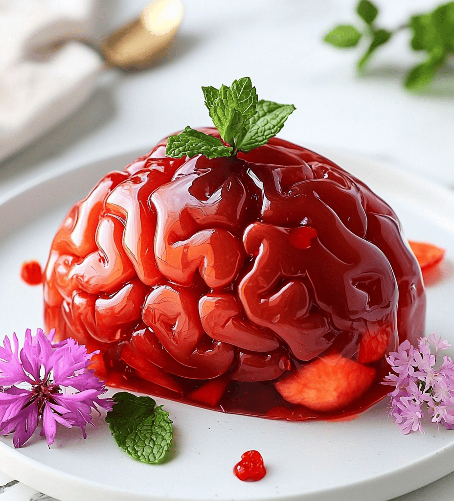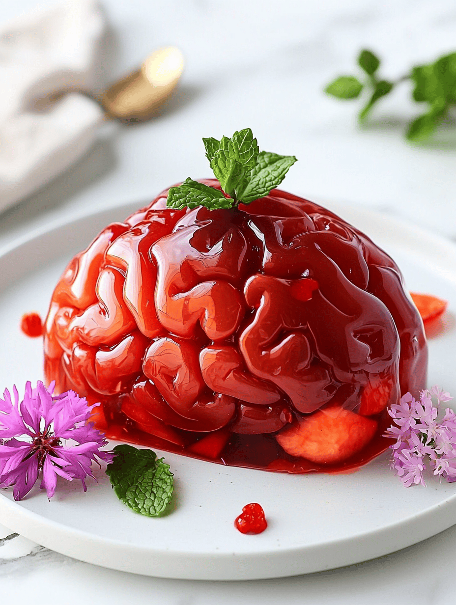 This Brain Jello Mold is a gelatin dessert shaped like a human brain, crafted with fruit-flavored gelatin layers that create a realistic, textured appearance. The dish involves dissolving gelatin, pouring layered sections, and chilling to achieve a jiggly, brain-like final form with a slightly rough surface and distinct lobes.